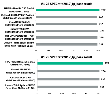 HPE ProLiant DL385 Gen10 lập kỷ lục về benchmark trên SPEC CPU2017, đánh bại các đối thủ socket chính để vô địch SPECrate2017_fp_base và SPECrate2017_fp_peak. Với bộ vi xử lý AMD EPYC 7601, sản phẩm của HPE có kết quả tốt hơn Lenovo, Dell, Cisco, Fujitsu và Huawei với platform 2 sockets.